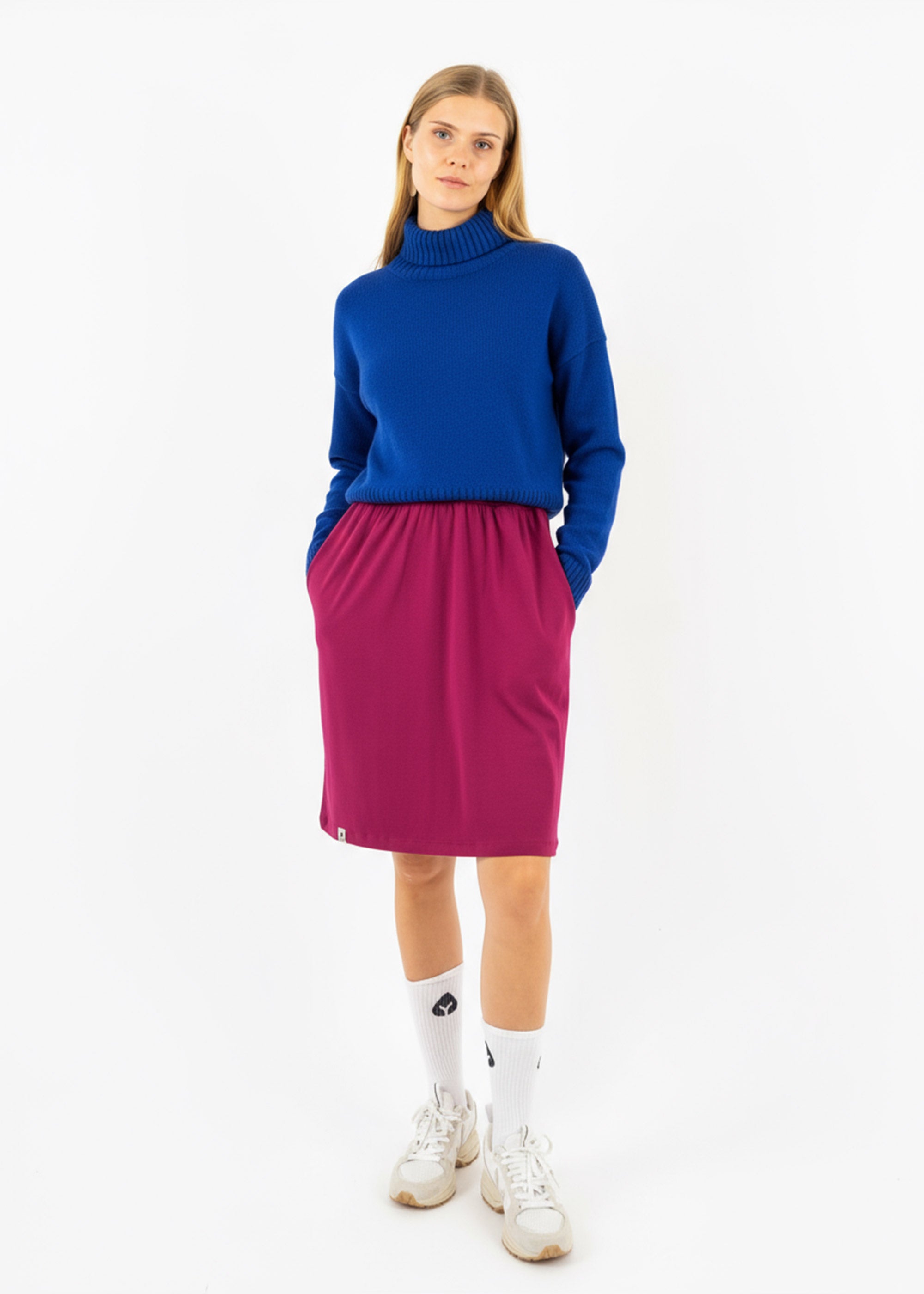 Wenn Gegensätze perfekt harmonieren: Das Bündel aus dem Strickpullover LÜÜTJE in Blue Iris und dem Strickkleid NORDFLAAR in Beaujolais vereint zwei intensive Farben, die sich gegenseitig leuchten lassen. Ein Look, der auffällt, ohne laut zu sein. Modern, warm und wunderbar cozy.